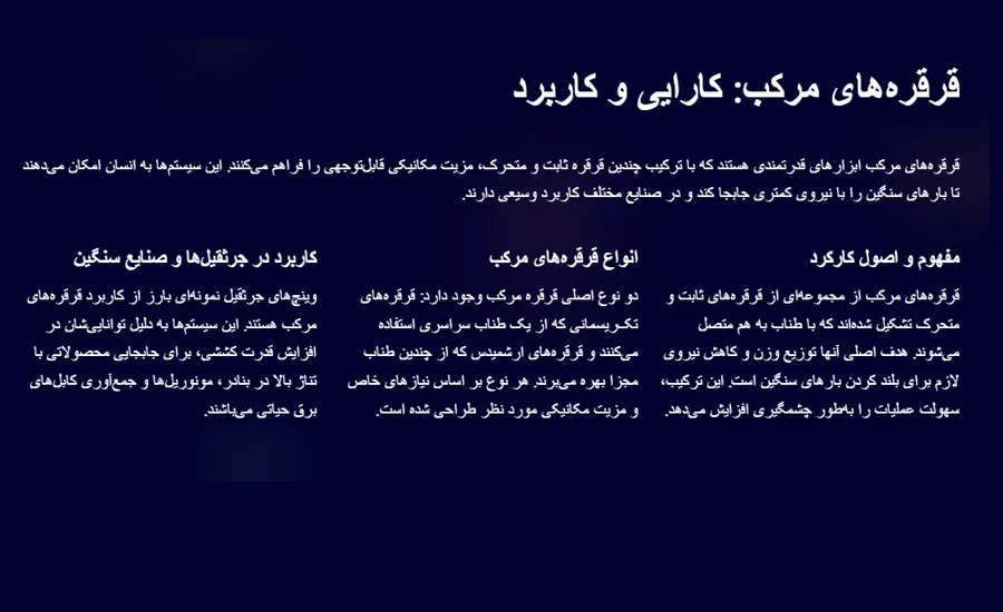 ترجمه فارسی:«قرقرههای مرکب سیستمی از دو یا چند قرقره هستند که با همکاری یکدیگر، بارهای سنگین را با سهولت بیشتری بلند میکنند؛ این کار با توزیع وزن و کاهش نیروی مورد نیاز انجام میشود.»