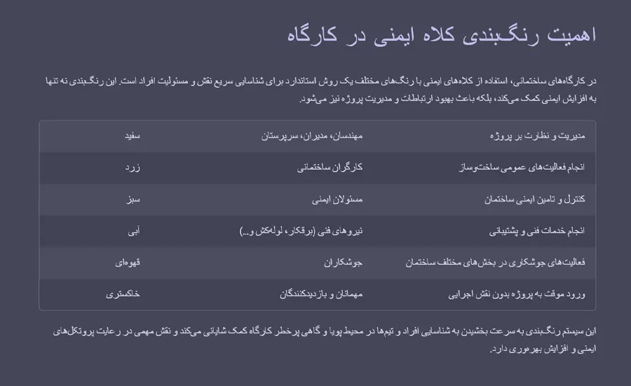 آقای ادمین میتونی یه جدول یا راهنمایی بزاری برای رنگ بندی کلاه ایمنی تو کارگاه ساختمانی؟ چون نمیدونم چه رنگی برای مهندسها و چه رنگی برای کارگرها خوبه، اصلا این رنگا به نظرتون واقعا تفاوتی ایجاد میکنن؟